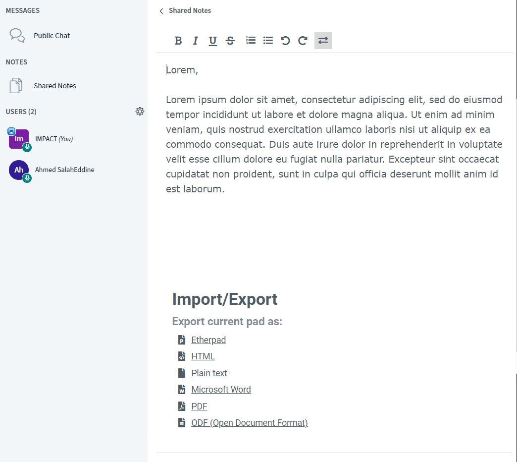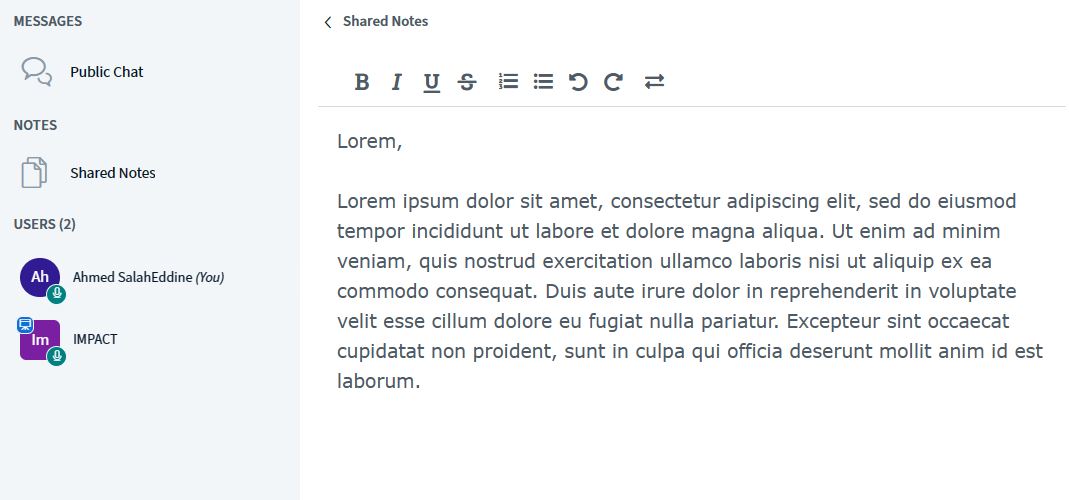 Dans le menu de gauche, vous pouvez ouvrir la fenêtre Notes partagées. Semblable à un Framapad simplifié, chaque participant peut écrire à en même temps, formant un document de notes partagées composé à partir des notes de tous les participants