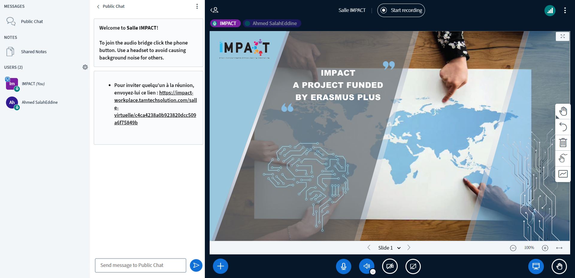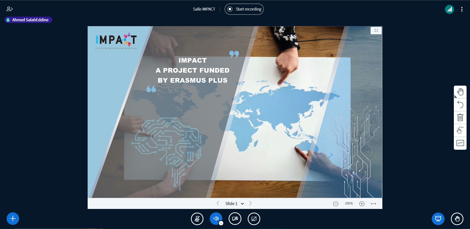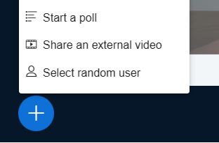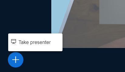 Dans le coin inférieur gauche de la présentation, le bouton avec un le signe plus donne accès aux actions du présentateur. Les modérateurs ont toujours accès à ce bouton. Cela leur permet de devenez présentateur (le précédent perd immédiatement cela statut).