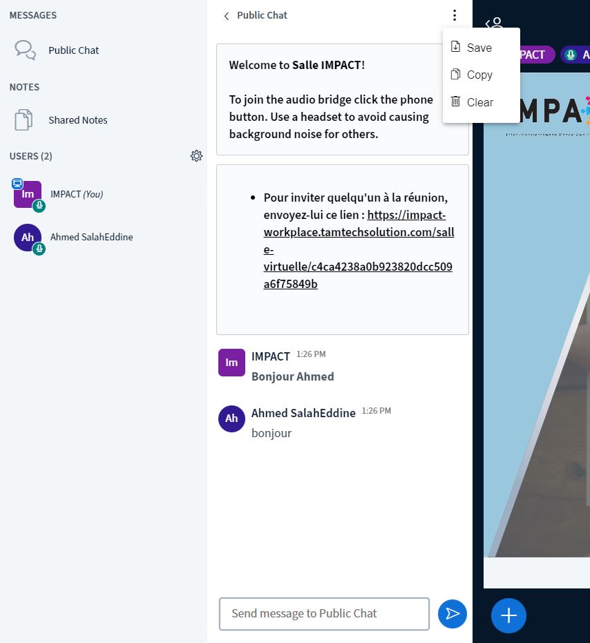 Outre la voix, il est possible de communiquer par écrit. Les La fenêtre "Discussion publique" s'ouvre lorsque vous vous connectez. C'est possible de le réduire et de l'afficher à nouveau via le menu en en cliquant sur Discussion publique.